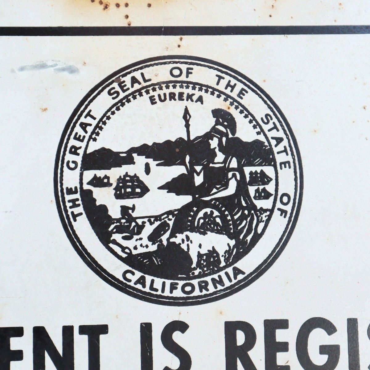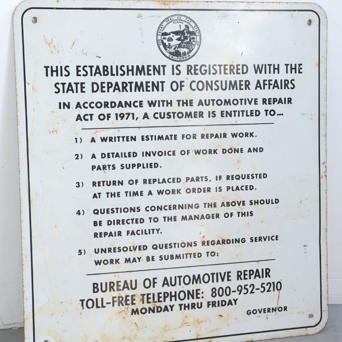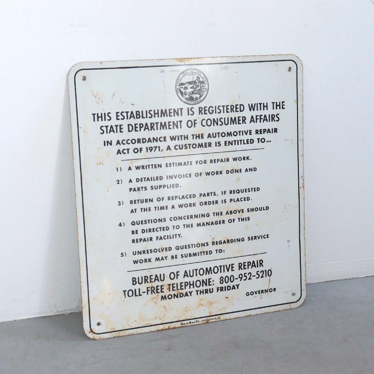 1970年代頃のヴィンテージ看板で、見積書の説明や詳細な請求書などを発行するように、カリフォルニア州の整備工場などに義務図けられた消費者の権利を保護する目的で作られた看板です。