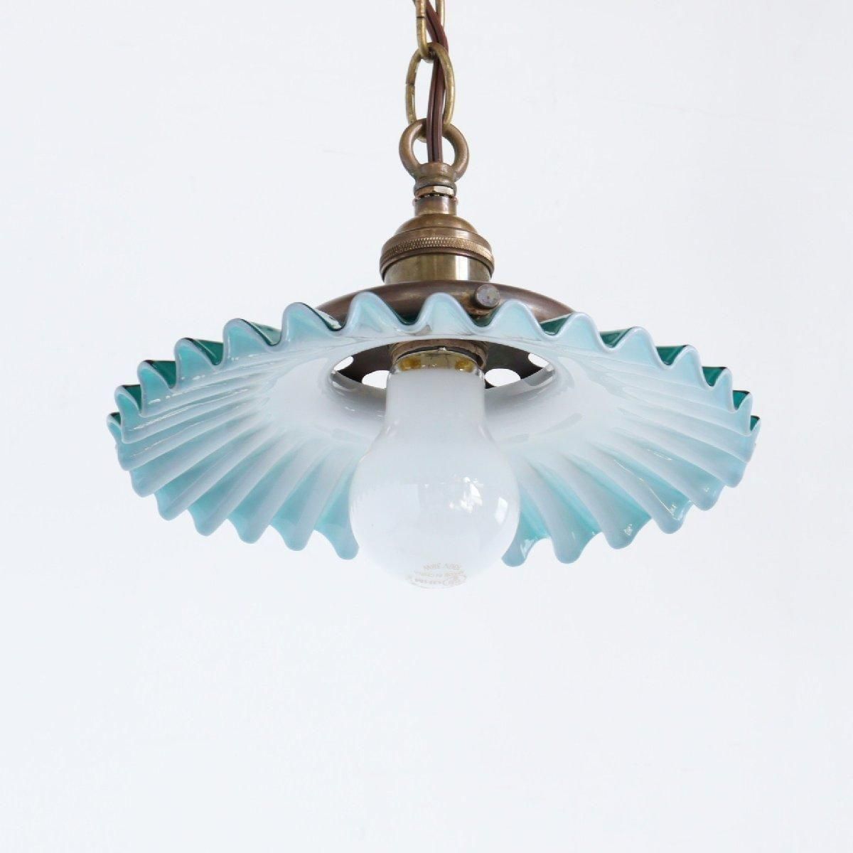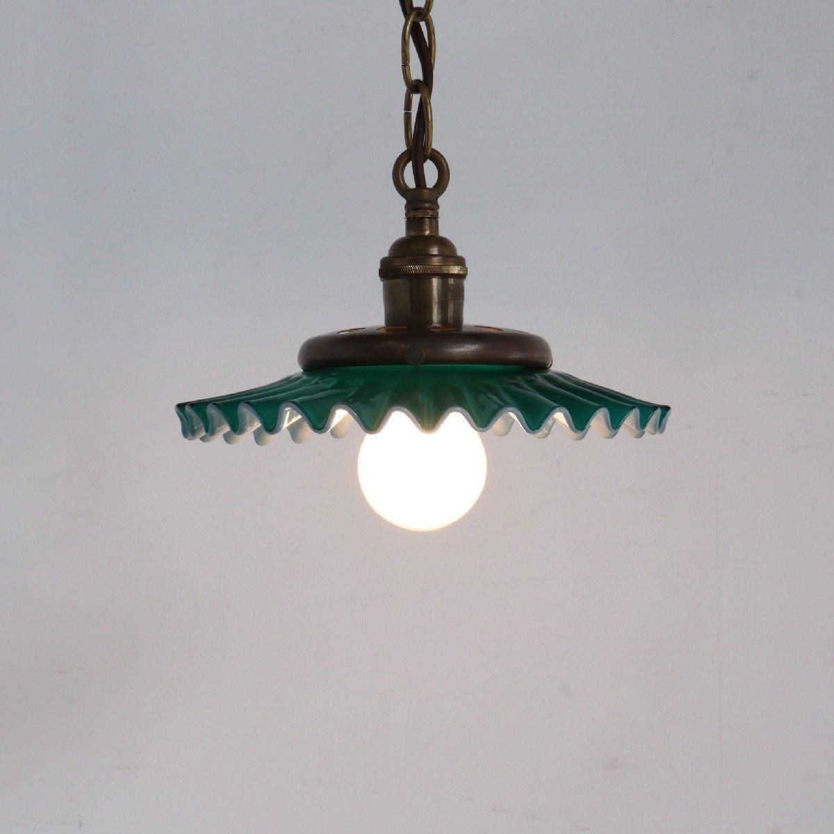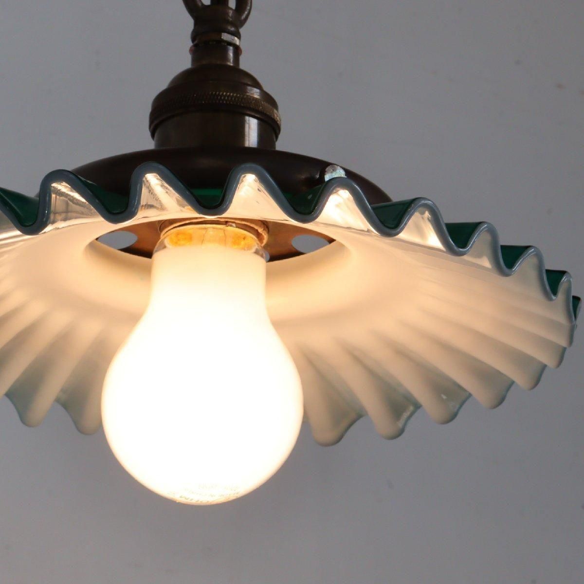 フリル型のシェードがとても魅力的で、グリーンとホワイトカラーのガラスが、優しく温かみのある光を灯してくれます。