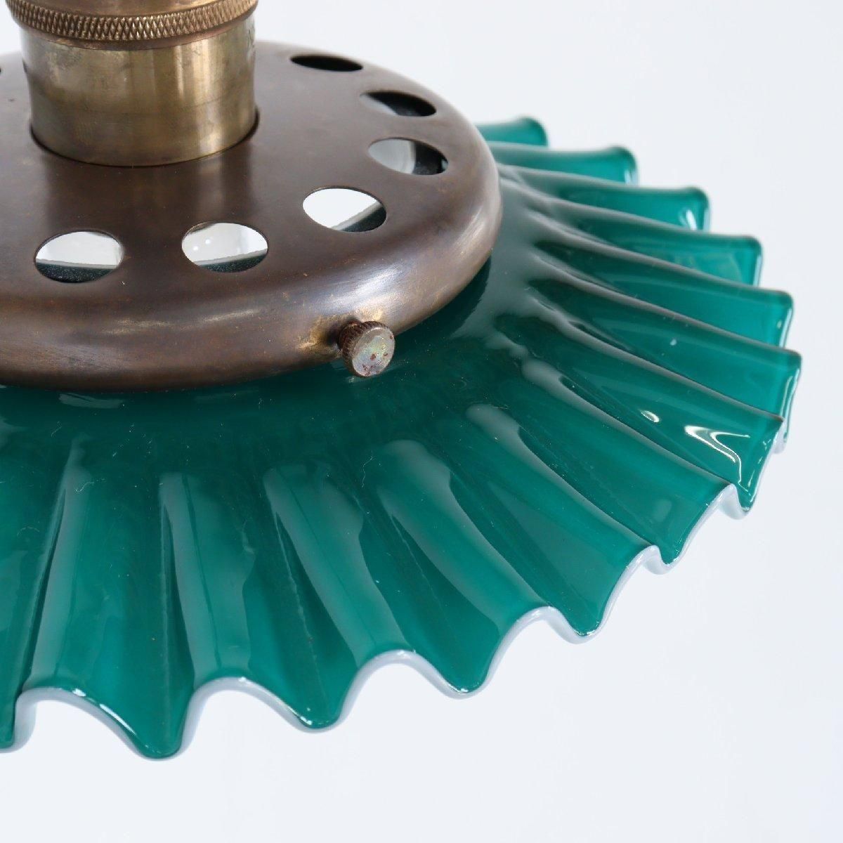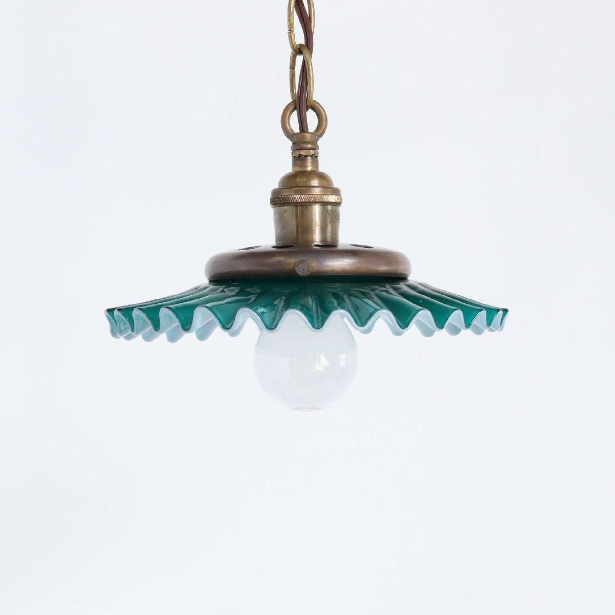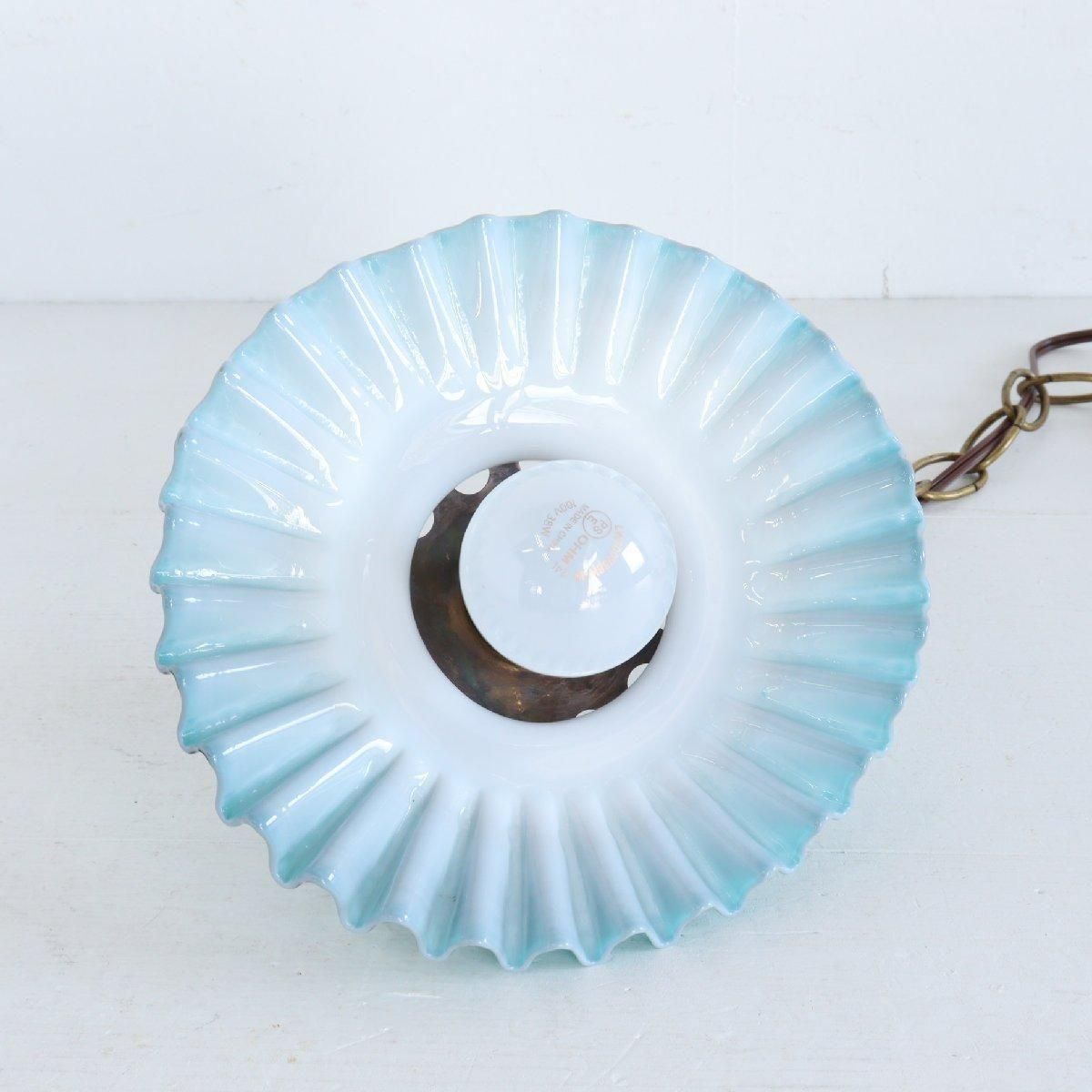 フリル型のシェードがとても魅力的で、グリーンとホワイトカラーのガラスが、優しく温かみのある光を灯してくれます。