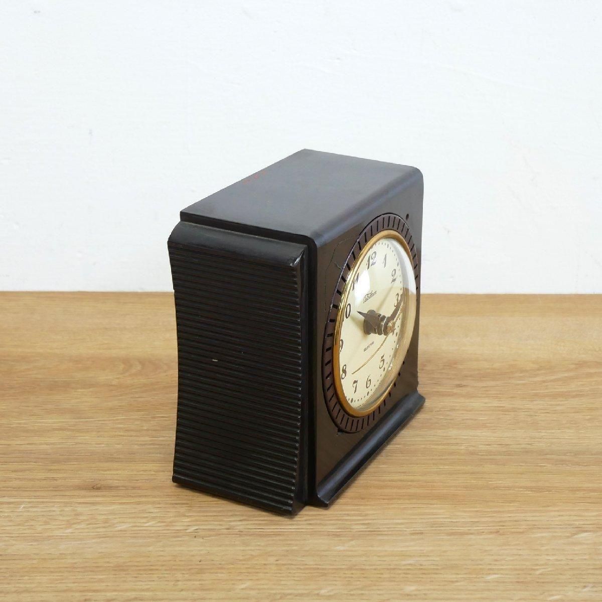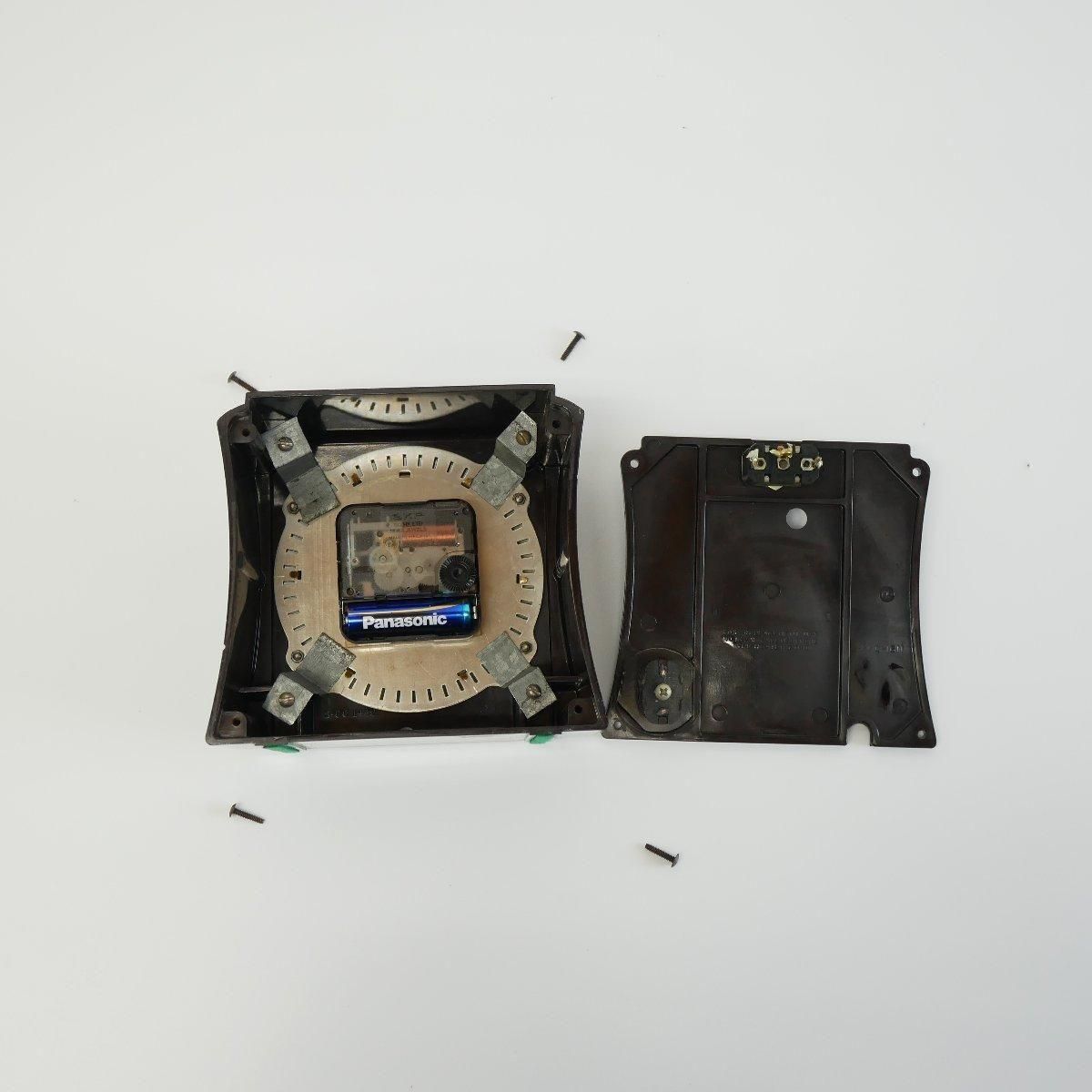 元はアラーム時計ですが、ムーブメントを交換したことにより、その機能はありません。10時あたりに割れた部分を修復した跡があります。また、変色や細かいキズなど、経年による劣化があります。裏のスイッチやコンセントもムーブメントを交換したことにより使用できません。