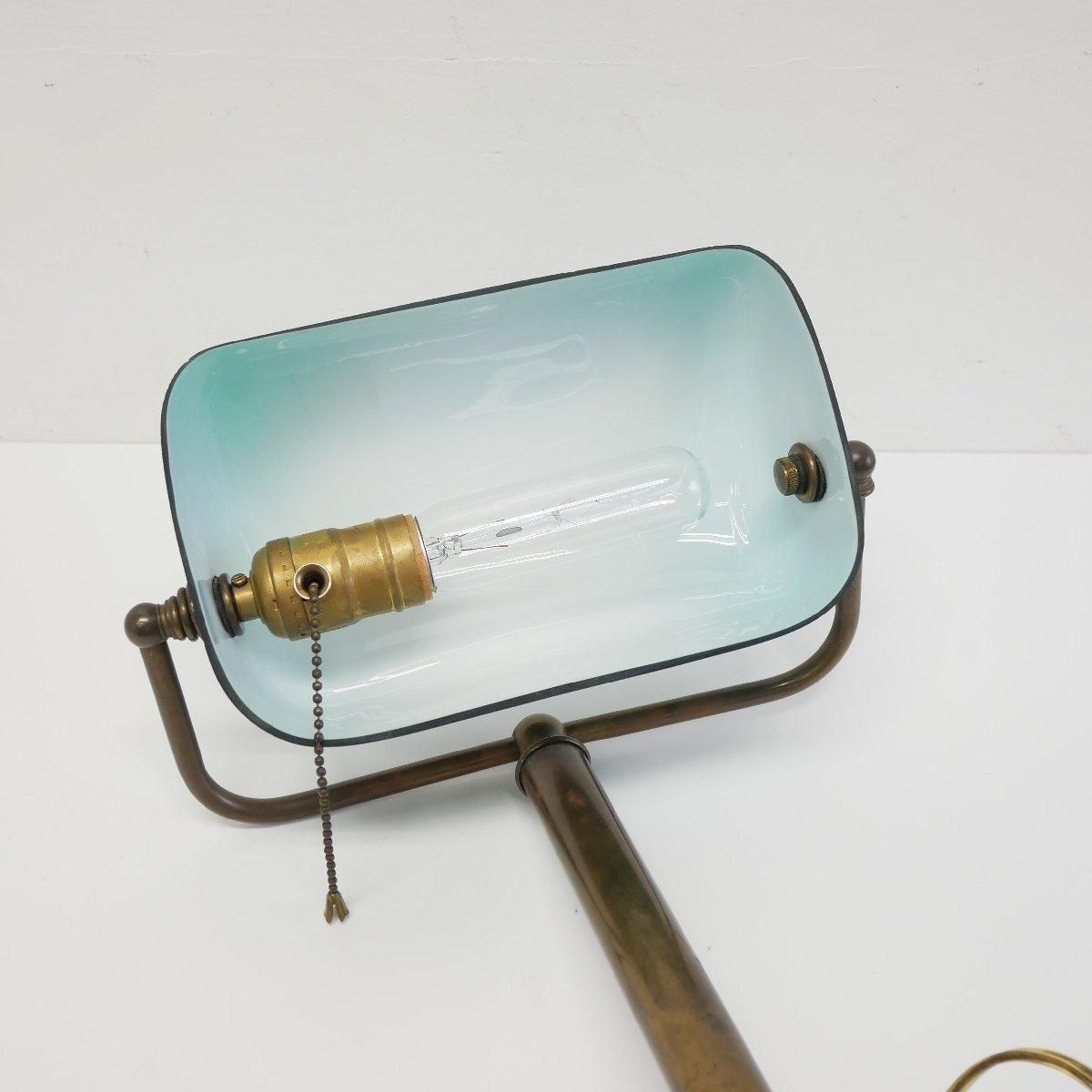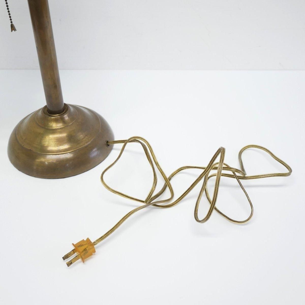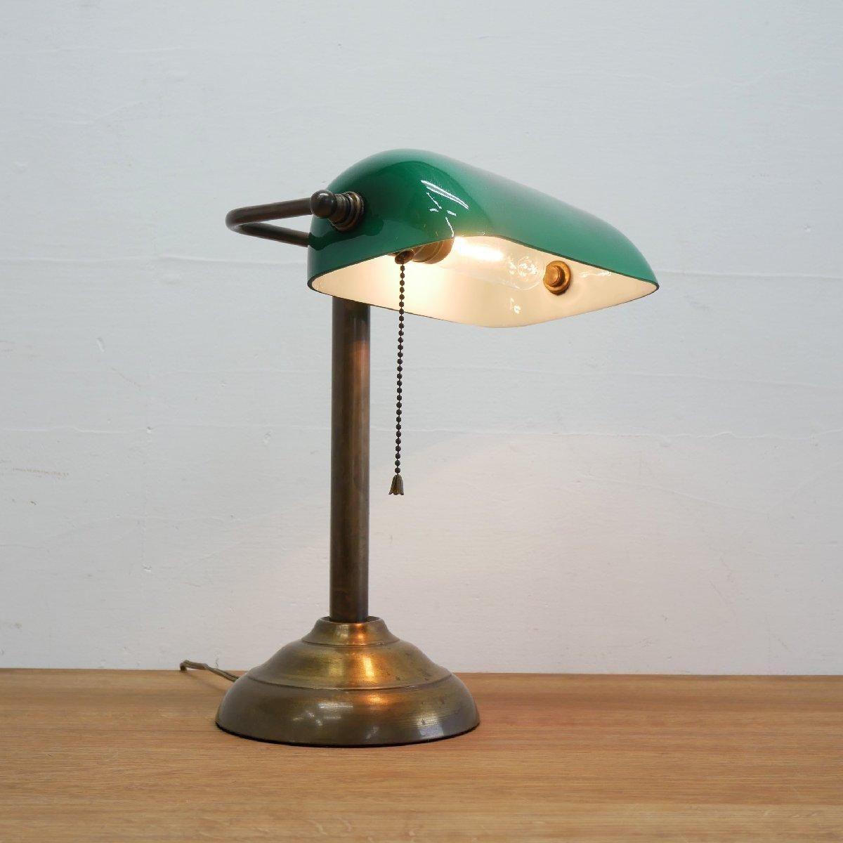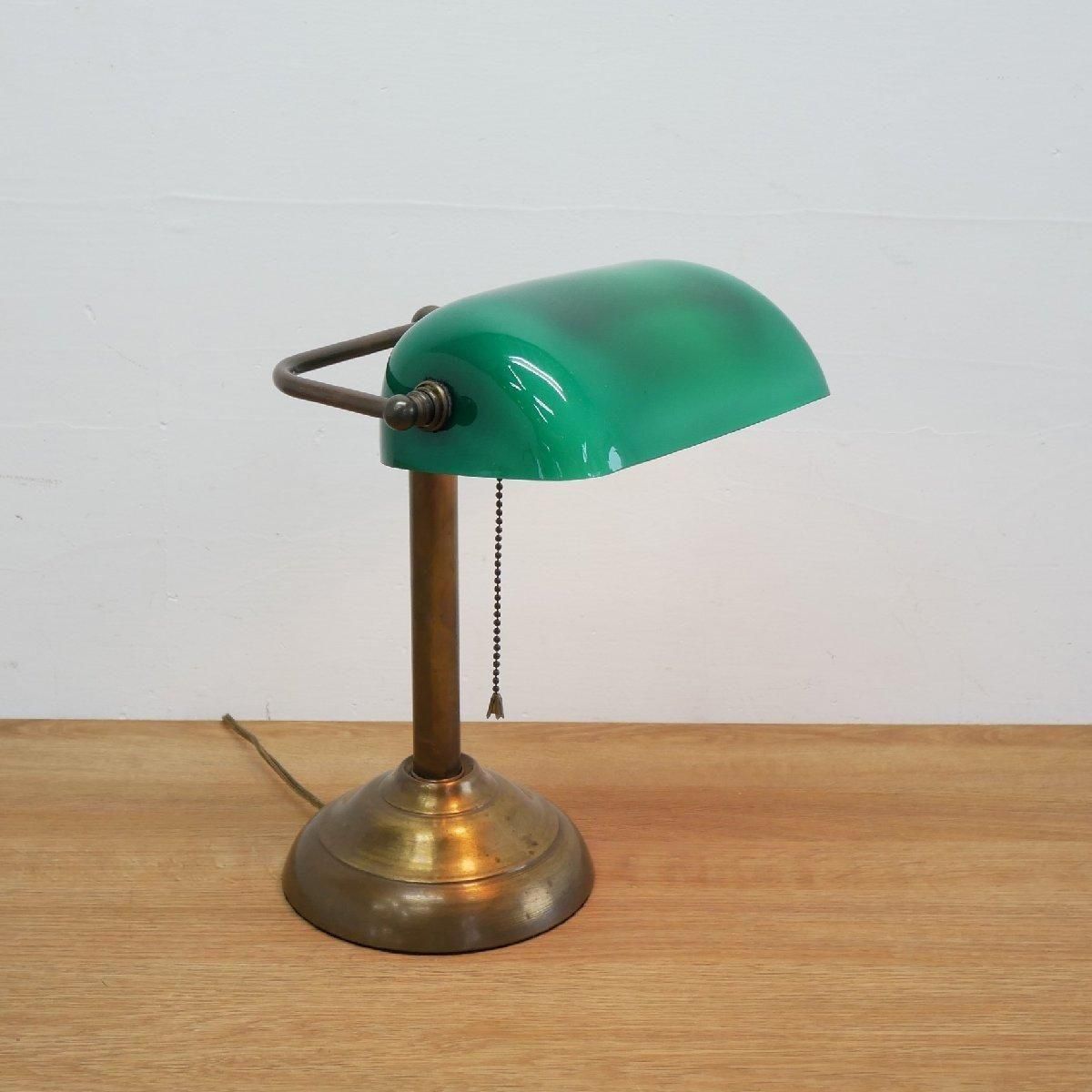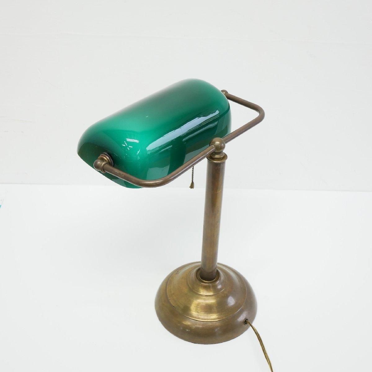 ガラスシェードは濃いグリーンで厚みがあり、台座や支柱は真鍮製です。