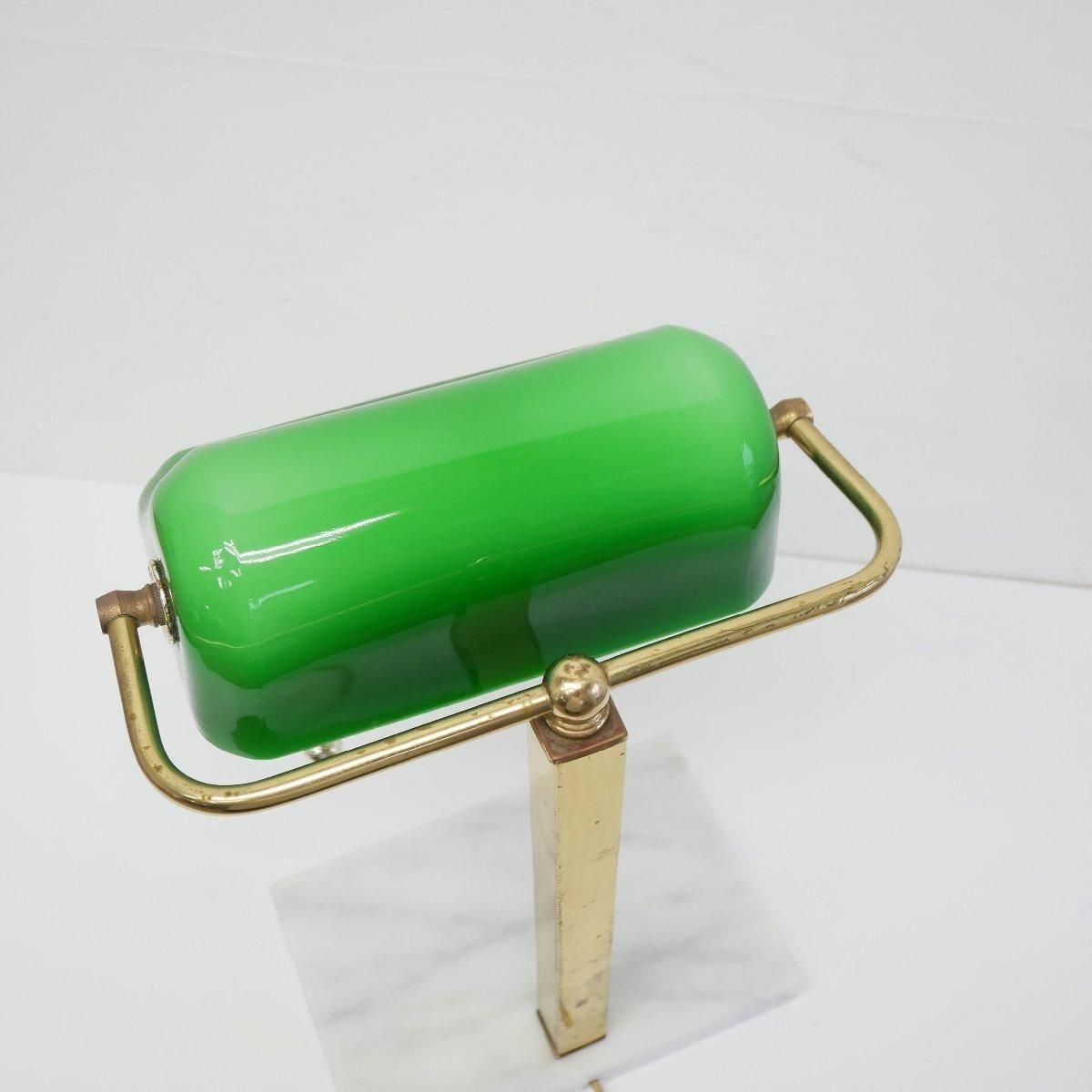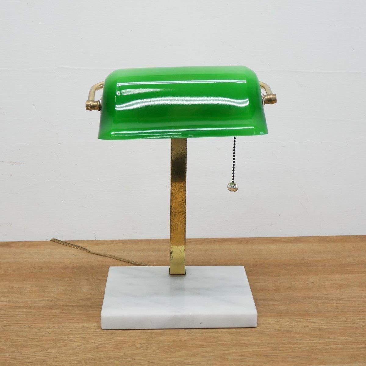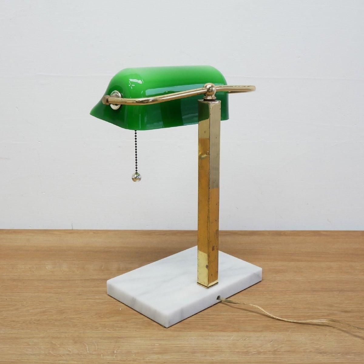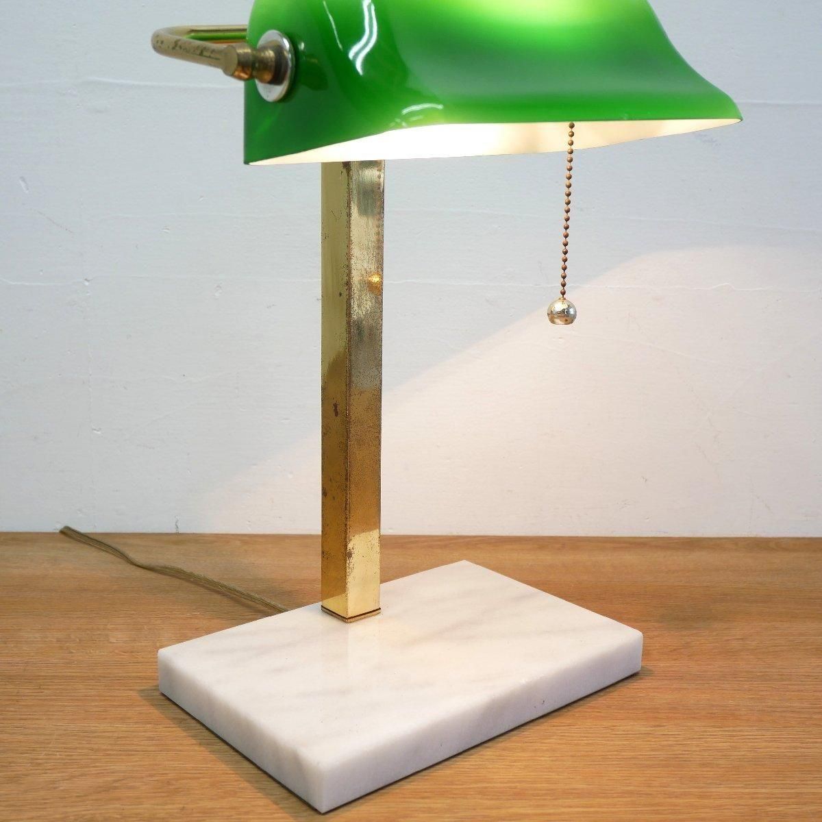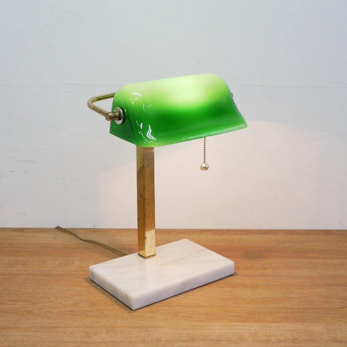 グリーンのガラスシェードで、台座が人工大理石、支柱はメタルです。