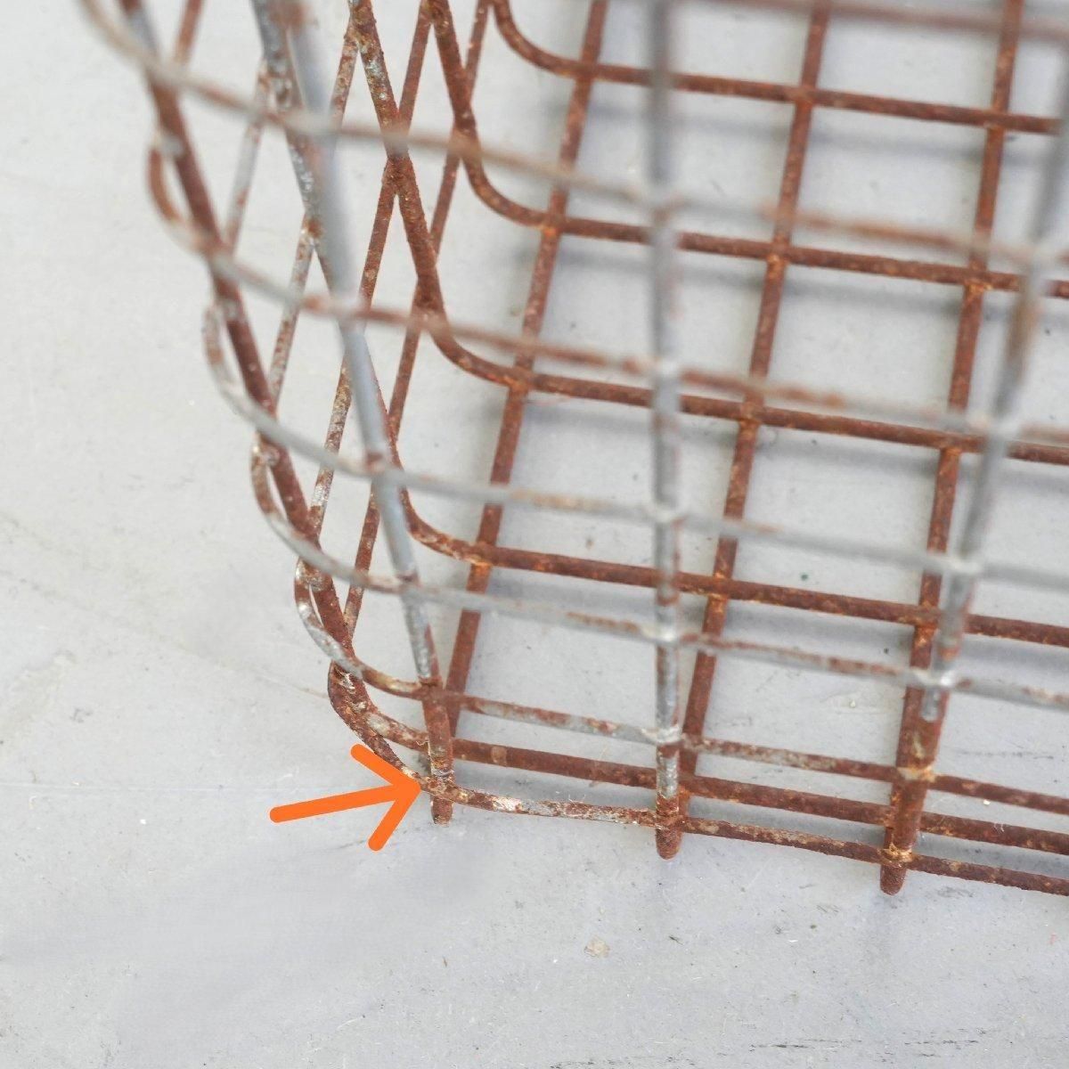 写真3枚目矢印部ワイヤーの外れ、全体的な歪み、サビや取れない汚れ、曲がり、キズ、経年による劣化があります。
