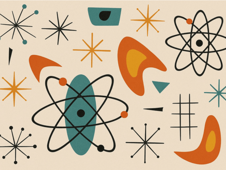 1950年代から60年代頃に流行したミッドセンチュリーモダンのデザインの一種で、原子の軌道、ロケット、惑星、星などをモチーフにデザインされ、幾何学模様など非対称的な形状などが特徴のデザインをアトミックデザインと呼んでいるみたいです。